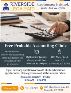 Riverside Legal Aid offers a free Probate Accounting Clinic providing individualized, one-on-one review of accounting schedules and consultations with an attorney. This clinic is ideal for individuals managing probate-related financial responsibilities who need guidance preparing or reviewing court-required documents.